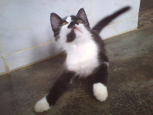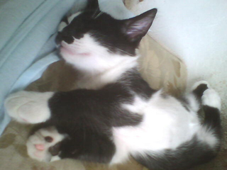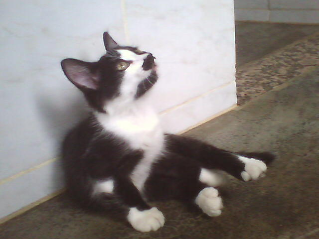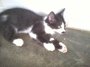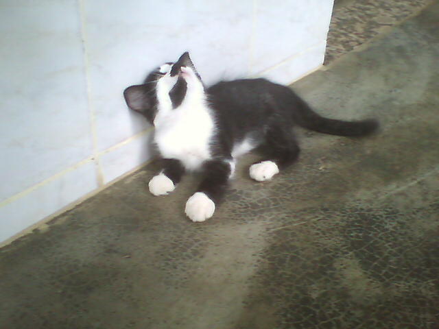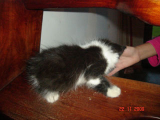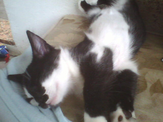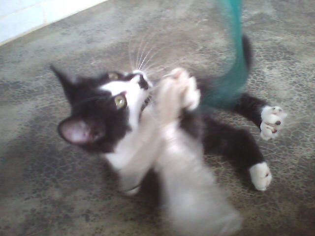 Certain time, when Kimê was playing with Giza and I on that mattress, I menaced one attack with one hand, then also with the other; Giza did the same, and, when Kimê was deciding which hand to attack first, I menaced him with one and then with the other foot! Oh... it was too much for him, and like in a cartoon, but in the real world, he gave some very highjumps, ran to the floor between the mattress and the wall and threw himself lying on the floor with the four paws moving in the air, opened a large mouth, with his tongue outside it, and started to oscillate his head from one side to another, as saying that he could not understand nor support so many attacking players (that he would do when he was an adult cat...) and that he was crazy! The best part of it is that it is a true case! He acted exactly like I told - or even better, because my English is attacking me from six sides now and I, a little cat in your language, resign to describe what I can't...