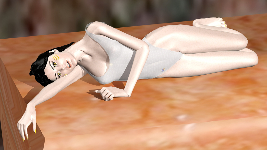 O novo boneco já tem os seios obedientes às leis da física - eles balançam com os passos de Ky. Tem outrossim uma só mesh: o corpo inteiro é formado em peça única, sem emendas como no boneco do balé acima. Os cabelos seguem os movimentos do corpo, todavia inda não os dotei de impenetrabilidade: eles atravessam, por enquanto, o corpo do boneco, mas já dão uma idéia do que poderão ser.