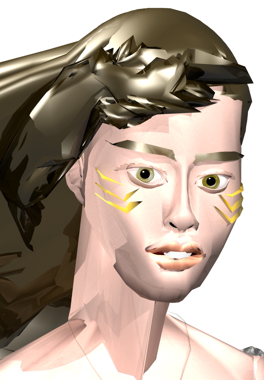 Vista aqui em close-up, Ky tem os olhos móveis e suas córneas possuem refração de acordo com as leis da física, no "boneco" tridimensional que para ela criei no computador. Todos os membros, inclusive dedos, falanges - tudo tudo - é também móvel neste ente de computação gráfica. O nariz de Ky já forma uma só peça com a face (ao contrário de em meus "bonecos" mais antigos - o de Arquisha, por exemplo), porém os seus cabelos não se compõem de fios separados (como nos "bonecos" mais recentes, verbi gratia: Rá, Talia e Terúlia).