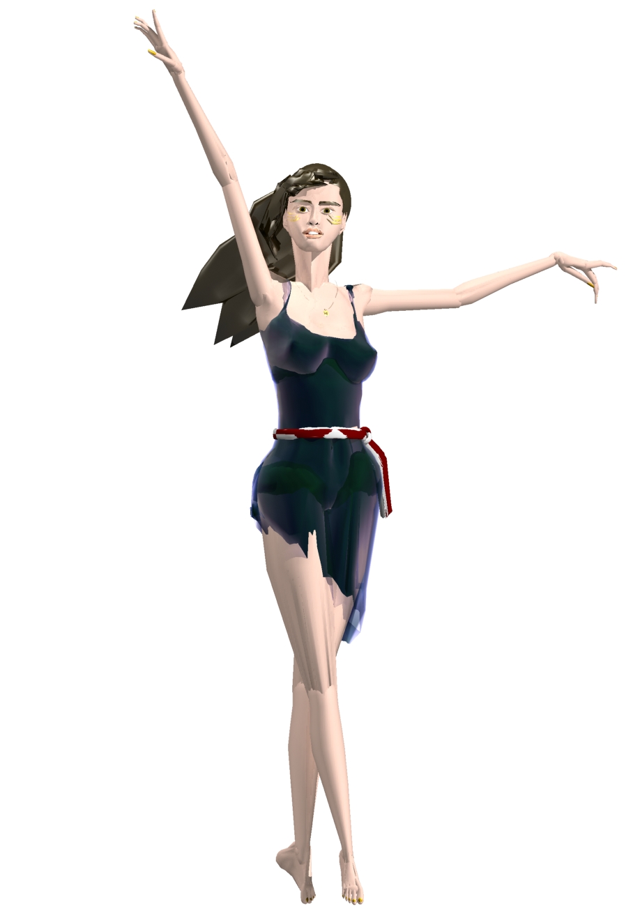 Ky tem os olhos móveis e suas córneas possuem refração de acordo com as leis da física, no "boneco" tridimensional que para ela criei no computador. Todos os membros, inclusive dedos, falanges - tudo tudo - é também móvel neste ente de computação gráfica. O nariz de Ky já forma uma só peça com a face (ao contrário de em meus "bonecos" mais antigos - o de Arquisha, por exemplo), porém os seus cabelos não se compõem de fios separados (como nos "bonecos" mais recentes, verbi gratia: Rá, Talia e Terúlia).