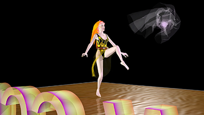 No primeiro balé que criei com a computação gráfica há um só segmento; nas versões seguintes de balé com Ky, precisei dividir a animação em dezenas de segmentos; caso contrário, nenhum computador pessoal conseguiria produzi-la. Para isso, autodidata, tive de inventar meus próprios meios de animação; o material que reuni com anotações bastaria para escrever um livro técnico - mas livro de leigo, pois não me considero profissional da animação. Em cada novo segmento, com tamanho médio de quinhentos "frames", igualei o "frame zero" ao último "frame" (fotograma) do segmento anterior e apaguei todas as chaves (keys) do segmento anterior - e isso me valeu, foi o que me permitiu concluir a animação. Para mover o boneco inteiro (pois o recurso original do aplicativo para isso nem sempre funciona) e para fazer piruetas simples, criei links entre certos pontos (pelvis) e controles (foot platforms) do RIG rumo a um "Point" de controle; para piruetas complexas, usei "link constraint" entre aquele "Point" e um novo "Point".