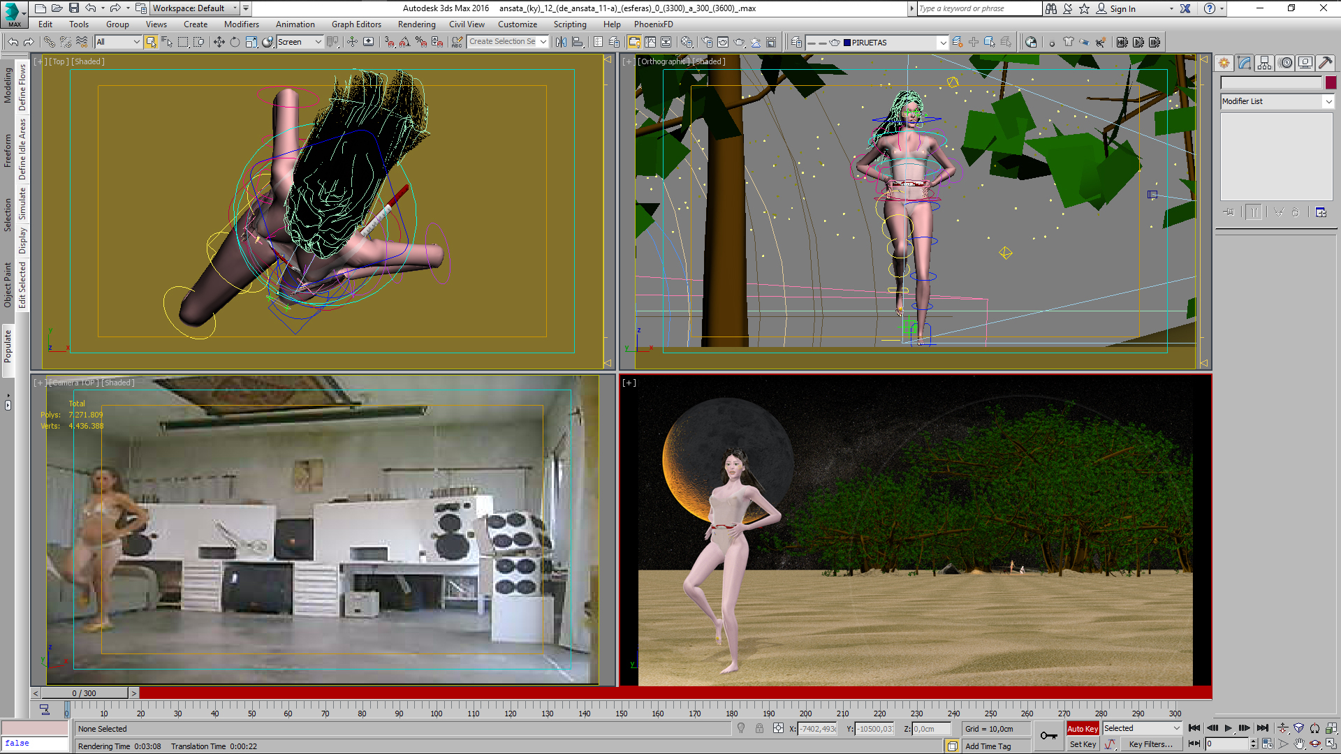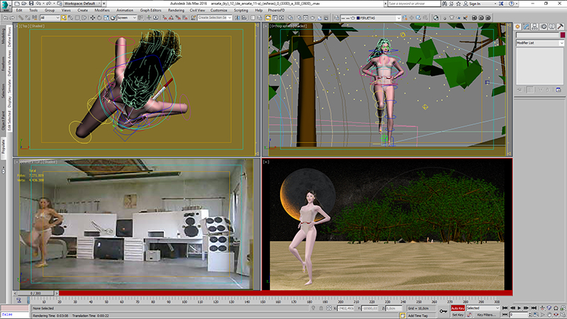 Cópia de tela (screenshot) da interface do 3ds Max 2016, onde as janelas (viewports) mostram o vídeo com
