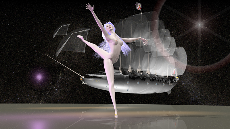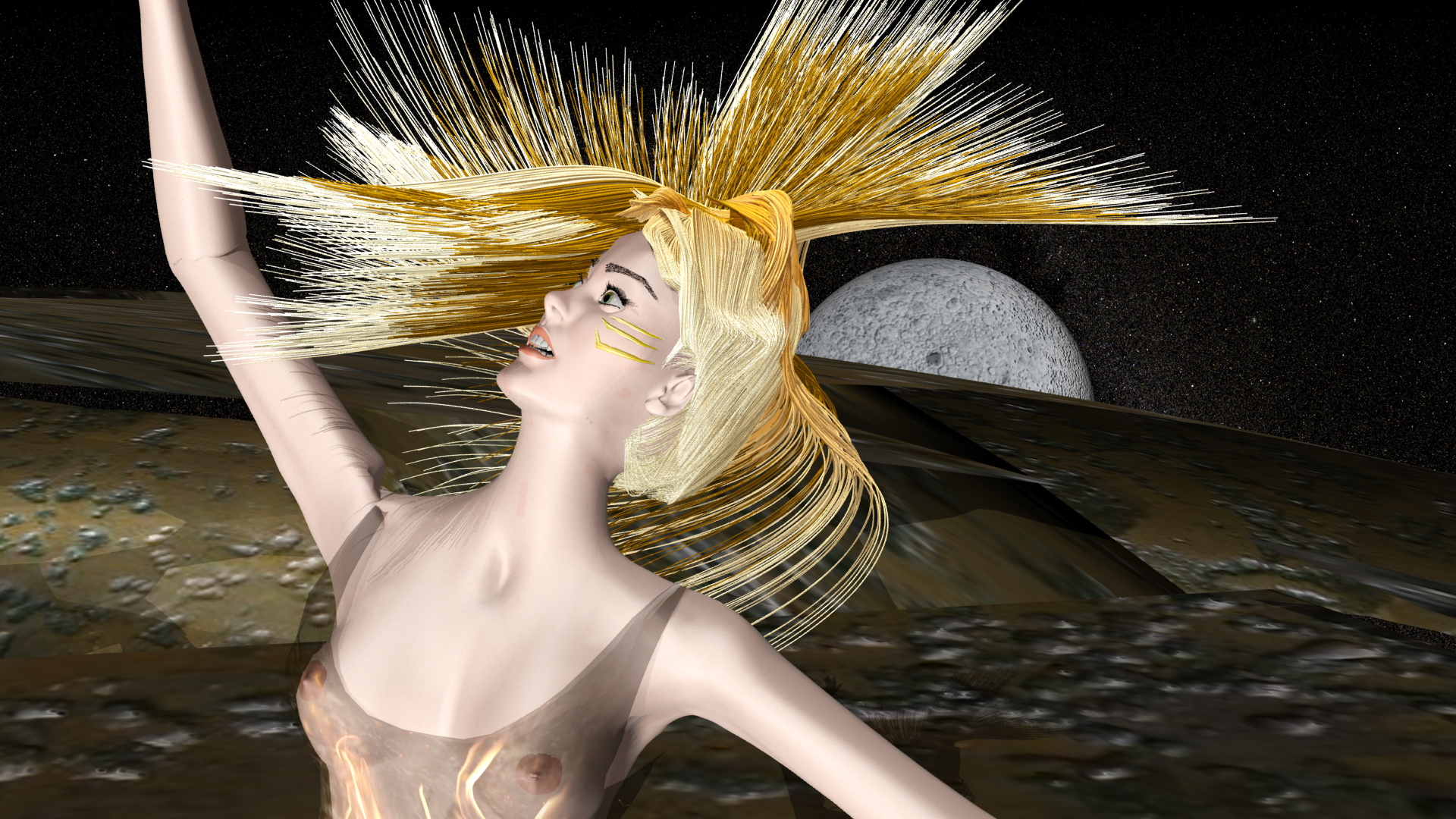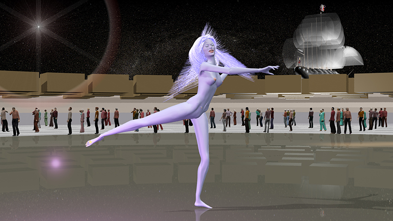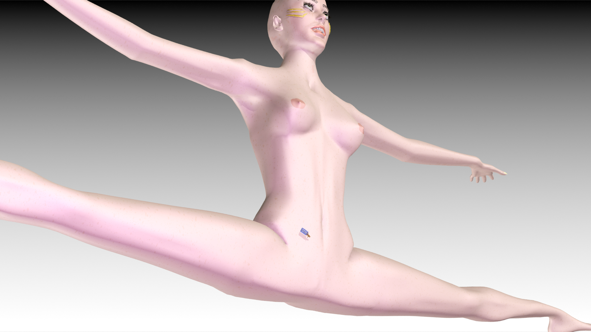 Nas imagens iniciais desta página, vemos Ky Hi-Tech 2017, versão 2017 do caractere de computação gráfica, ou “boneco” que representa Ky, a Maior Bailarina do Universo, filha-amante de Clausar e uma das mais importantes protagonistas de Géa. A maior parte dos aperfeiçoamentos de Ky Hi-Tech 2017, com relação a Ky Hi-Tech 2016, são detalhes técnicos da computação gráfica e ajustes de parâmetros que me possibilitam um trabalho mais perfeito na produção das animações; por exemplo, os materiais para os trajes de Ky e os seus cabelos, os quais agora dançam tão bem quanto ela própria. Um dos detalhes visíveis é o da cor das íris que, em Ky Hi-Tech 2017, exibem a imagem das minhas próprias íris, com o material criado por mim a partir da foto de um dos meus olhos, mantendo-se preservada a possibilidade de alterar o tamanho das pupilas, conforme a luz e as emoções de Ky. O aperfeiçoamento em Ky Hi-Tech 2019 com relação a Ky Hi-Tech 2018 foi no interfemínio e na virilha, permitindo-me dobrar as pernas do “boneco” sem que se formem pregas nas coxas e no quadril - ver duas imagens mais abaixo.