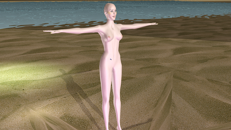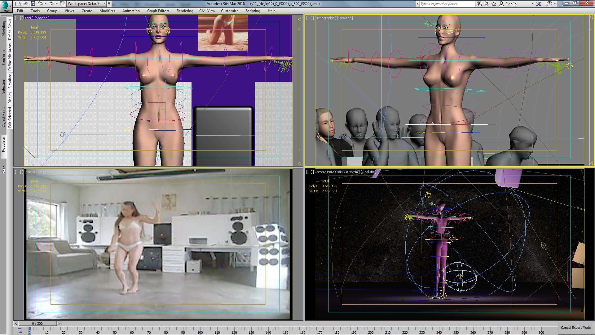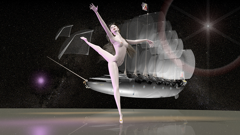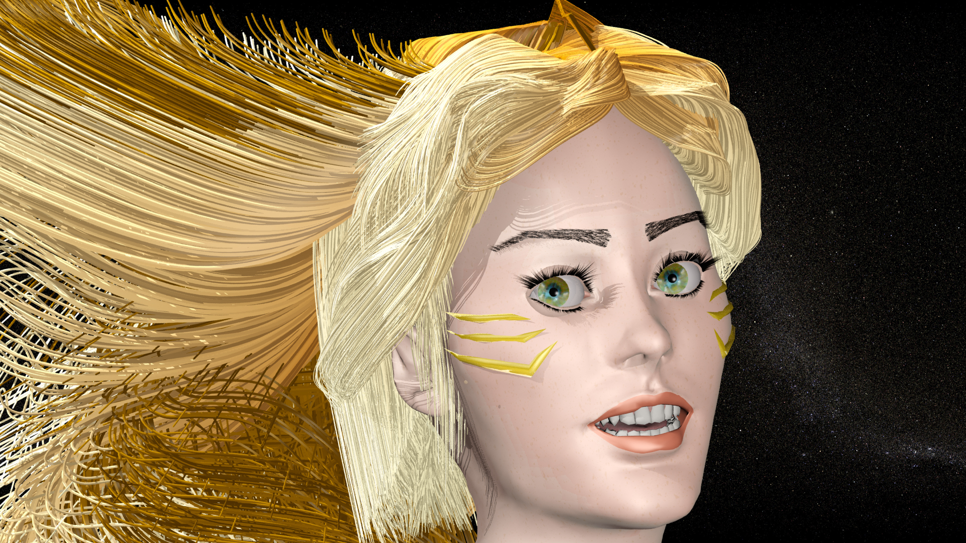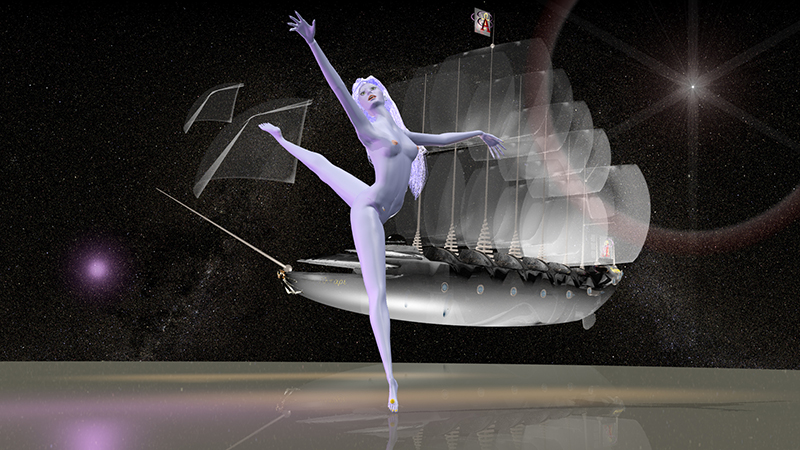 Nas imagens iniciais desta página, vemos Ky Hi-Tech 2017, versão 2017 do caractere de computação gráfica, ou “boneco” que representa Ky, a Maior Bailarina do Universo, filha-amante de Clausar e uma das mais importantes protagonistas de Géa. A maior parte dos aperfeiçoamentos de Ky Hi-Tech 2017, com relação a Ky Hi-Tech 2016, são detalhes técnicos da computação gráfica e ajustes de parâmetros que me possibilitam um trabalho mais perfeito na produção das animações; por exemplo, os materiais para os trajes de Ky e os seus cabelos, os quais agora dançam tão bem quanto ela própria. Um dos detalhes visíveis é o da cor das íris que, em Ky Hi-Tech 2017, exibem a imagem das minhas próprias íris, com o material criado por mim a partir da foto de um dos meus olhos, mantendo-se preservada a possibilidade de alterar o tamanho das pupilas, conforme a luz e as emoções de Ky. O aperfeiçoamento em Ky Hi-Tech 2019 com relação a Ky Hi-Tech 2018 foi no interfemínio e na virilha, permitindo-me dobrar as pernas do “boneco” sem que se formem pregas nas coxas e no quadril - ver duas imagens mais abaixo.