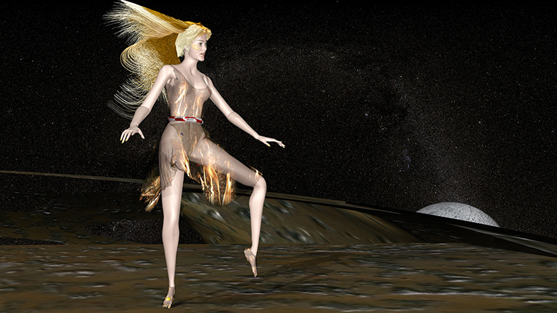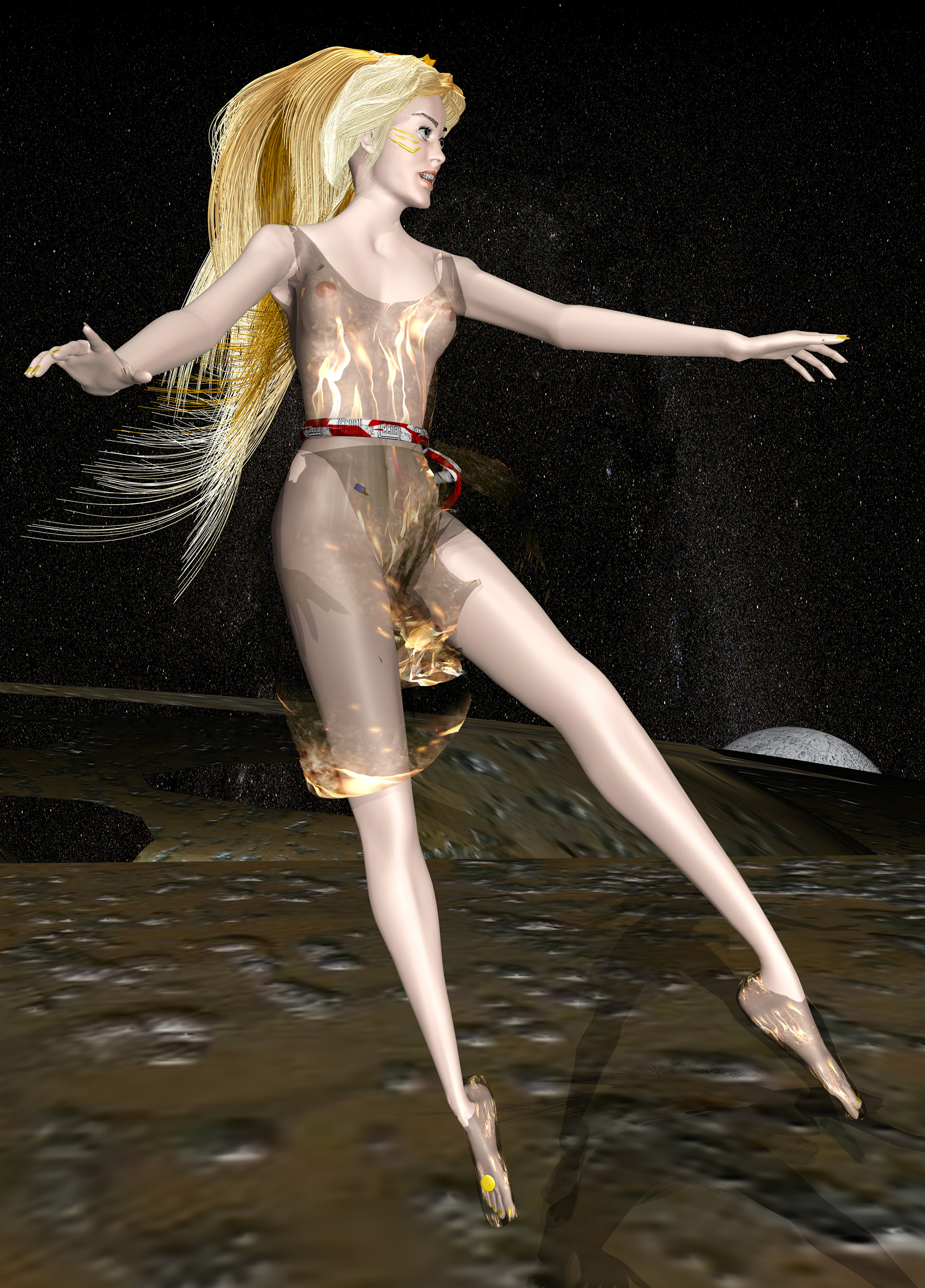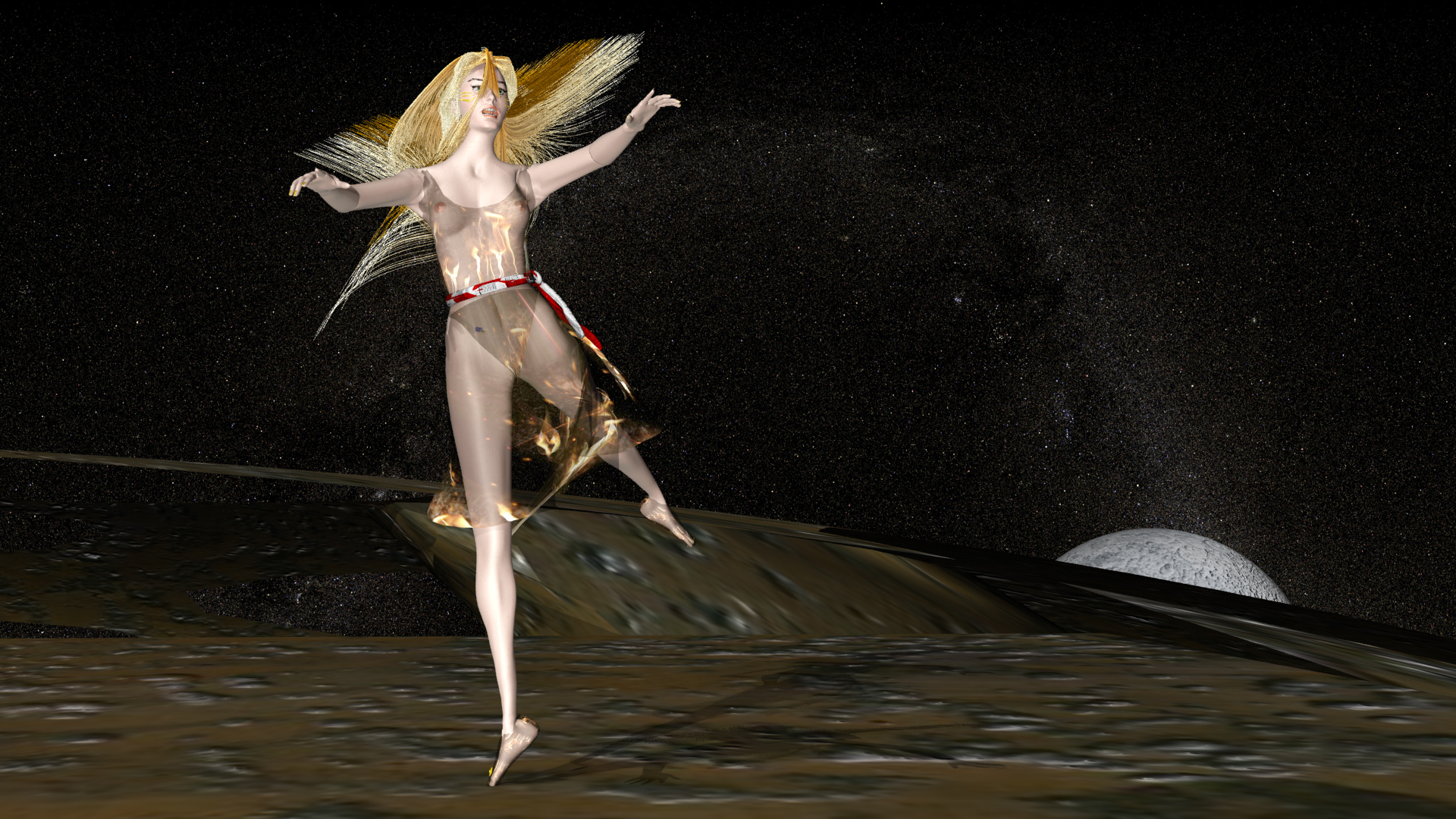 Acima, captura de tela (screenshot) de Ky 2018, com a cintura mais fina e mais parecida com a verdadeira Ky. O colante (oculto na imagem) e as faixas (idem) foram estreitados proporcionalmente, como se verá na animação "Ky dança a Valsa da Luz", a partir do ponto onde fiz a modificação na cintura, resultando em Ky 2018. O afinamento da cintura é sutil; observando com atenção as duas ilustrações acima, você verá a diferença. Na animação se notará ainda mais. Clique na ilustração para ver em tela cheia.