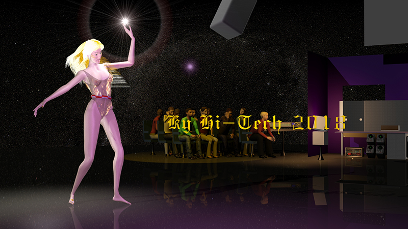 Em 25-11-2017, durante a produção de Ky dança a Valsa da Luz, afinei a cintura do caractere de computação gráfica, chamado Ky Hi-Tech 2017-B que, com isso, tornou-se Ky 2018, mais parecida ainda com a verdadeira Ky - veja as ilustrações bem mais abaixo nesta página, onde Ky aparece no Laboratório CCDB durante a gravação com o Psicossintetizador Alfa. Na animação supracitada (e nas que se seguirem) com Ky em movimento, será muito mais perceptível a melhora, que na imagem abaixo é sutil.