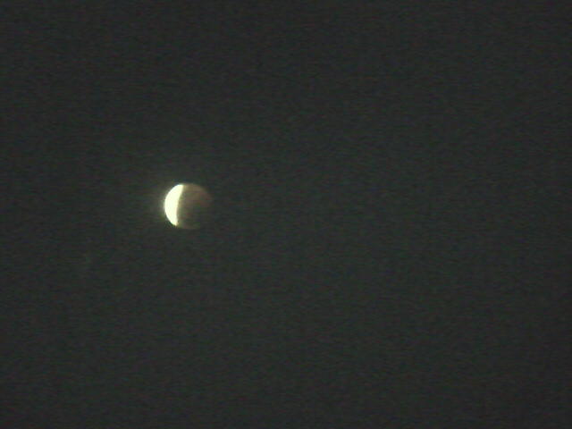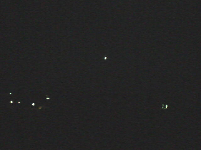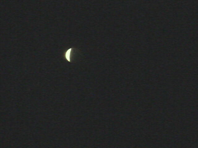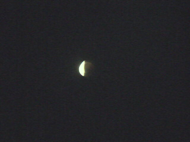 Chamei o Rá, pedindo-lhe que trouxesse o mesmo péssimo telefone celular, nossa única "máquina fotográfica". Ele o trouxe, e batemos uma foto da Lua - ela é o pontinho luminoso mais alto na imagem seguinte, sendo os outros pontinhos, mais abaixo, luzes das casas da redondeza. Nota-se, pois, que a Lua está recém-saída do horizonte leste: