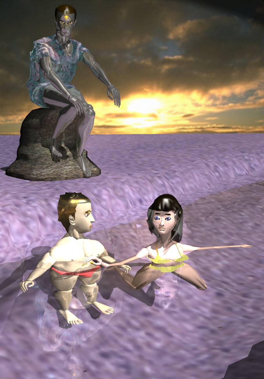 Talia, Rá e Tóxia banham-se no riacho avessado.