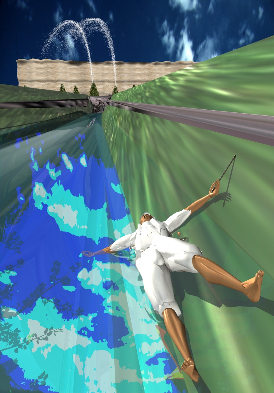 Sua mão direita fica mergulhada na água do riacho, onde as