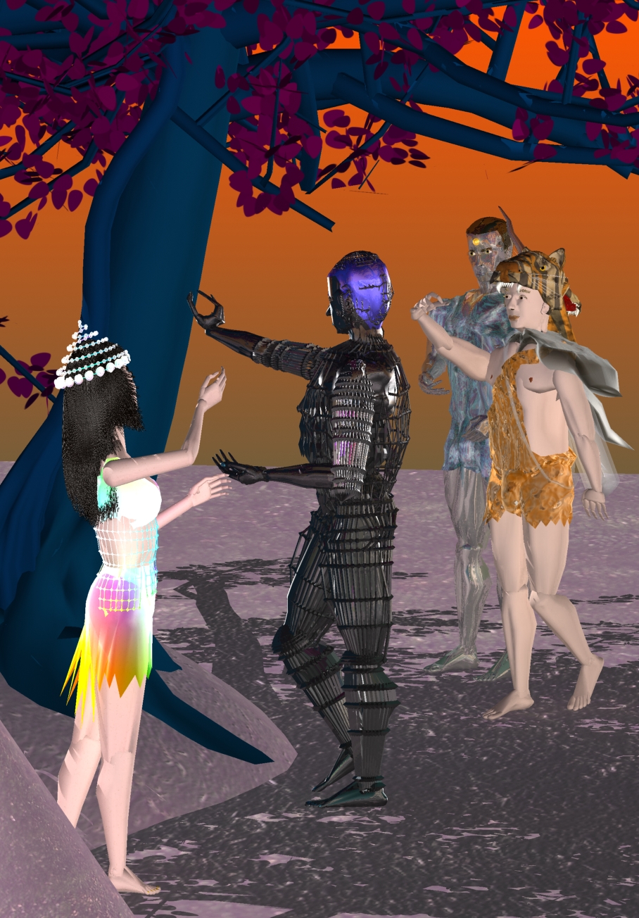 Obor, o robô avessado, toca a trônquia (árvore do planeta Géa)