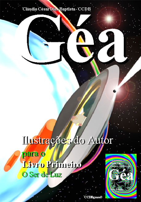 Livro de ilustrações para o Livro Primeiro de Géa O Ser de Luz Veja abaixo a belíssima capa do livro eletrônico que o autor de Géa já tem pronto para apresentação a editores, com o intuito exclusivo de publicá-lo impresso em papel! Texto de Géa ao qual se liga esta ilustração: - Voa Laranja! Enverga as asas do relâmpago! Sublima os ares, avante do arco-íris! - eis a 336 Laranja 1509-A na atmosfera de Géa! Para não frustrar de todo os entusiastas, Clausar autorizou-me a tecer alguns comentários sobre o sistema de propulsão espacial, extra-atmosférico. Com ou sem prévia aceleração atmosférica Ionomag; ao alcançar o espaço exterior, a Laranja passa a ser impelida pelo Gravitor; este não deve ser usado no ambiente aéreo, pois causaria fluxos catastróficos nos gases e nos próprios meios sólidos. No espaço, pode ser aplicado sem riscos. Na ionosfera, de 40 a 700kt (quilotrezêmbilhos), os anéis iônicos deformam-se e lançam centelhas, perdendo eficiência; então, Clausar aciona o Gravitor. O Gravitor baseia-se no controle do âmbito gravitacional relativo entre a ritmonave e qualquer astro. Como sabemos, cada um dos doze raios do volante possui seu reator estelar e tem um ducto no interior. Para movimentar a nave no espaço sem atmosfera, o buraco negro de um dos reatores é aberto, e o campo dirigido por dentro de seu ducto até um furo no perímetro da Laranja, bem na beirada exterior do volante. O furo à saída de cada ducto pode ser orientado para qualquer direção externa à Nau. Basta abrir e apontar o furo a uma estrela, e a intensíssima atração gravífica entre buraco negro e astro, mesmo distante, puxa a Nau de Géon nesse rumo, pois Clausar elimina a inércia do buraco negro sem eliminar-lhe a gravidade. Quando mais aceleração é indispensável, mais furos são colimados a outros astros, ancorando neles a ritmonave. Até mesmo a matéria gasosa interestelar e os corpos extragalácticos podem ser alvo do sistema. Não falta apoio no “vácuo”!...
