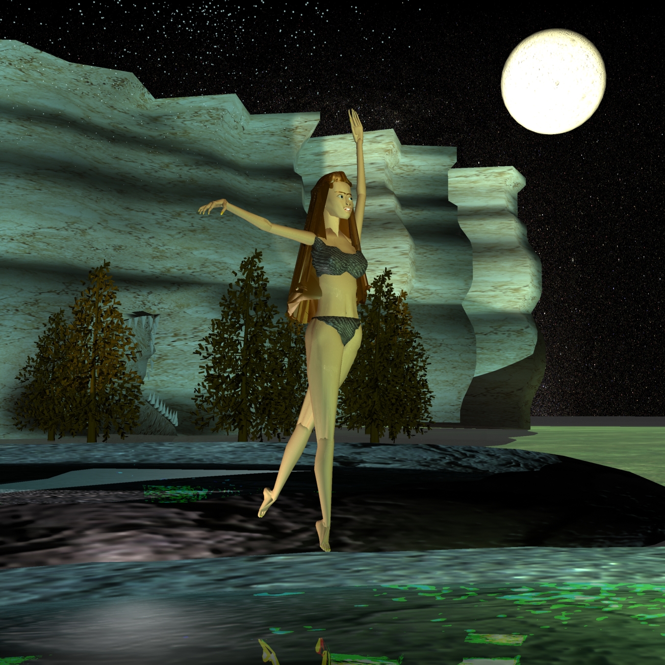 Nesta ilustração, Manitsa dança sob os borrifos dos gêiseres, as estrelas e a Lua, em frente da Caverna do Trigonodon, há quarenta mil anos! Essa parte da história é contada em Geínha.