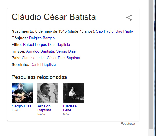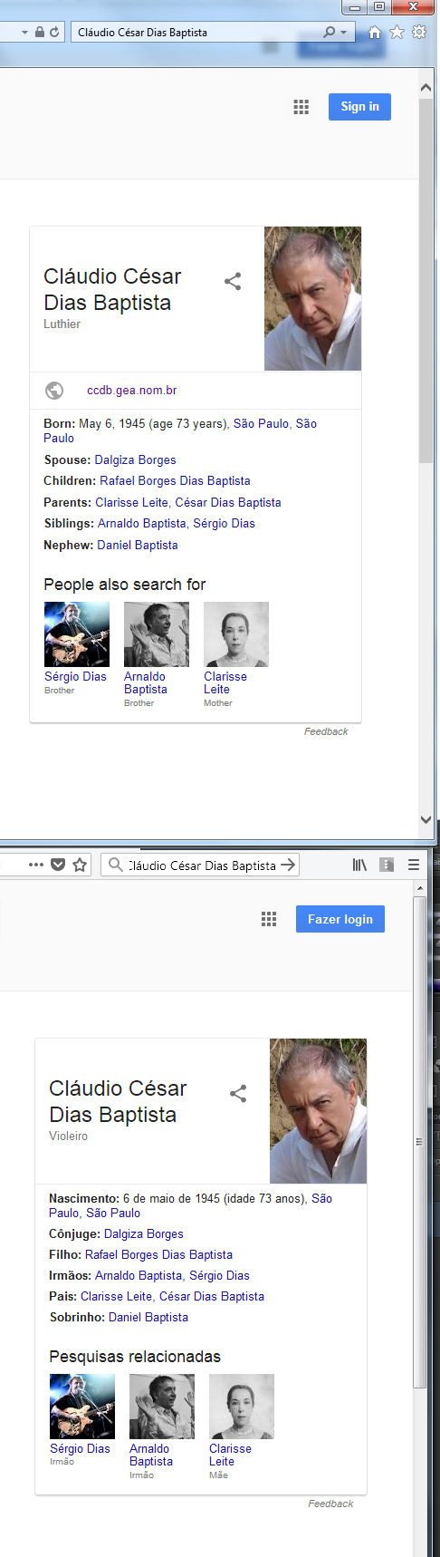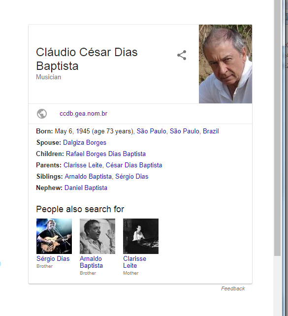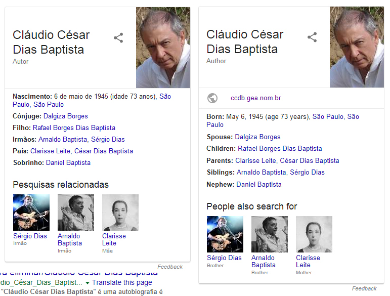 O TIME NORTE-AMERICANO DO GOOGLE MOSTROU-SE CORRETO E ISENTO DE googlepalhaços EM 08-07-2018 (IDEM, O TIME BRASILEIRO EM 09-07-2018), QUANDO CORRIGIU O MEU NOME NOS RESULTADOS PARA BROWSERS CONFIGURADOS EM INGLÊS, ONDE BUSCANDO-SE POR “CLÁUDIO CÉSAR DIAS BAPTISTA” PASSOU A APARECER O NOME COMPLETO NO RETÂNGULO À DIREITA DO RESULTADO, QUE SE CHAMA “PAINEL DO CONHECIMENTO (KNOWLEDGE PANEL)” E MOSTROU CORRETAMENTE A MINHA PROFISSÃO PRINCIPAL: “AUTHOR”; MAS, NO DIA SEGUINTE, MUDOU-ME A PROFISSÃO PARA “MUSICIAN”, PORTANTO, IGUALOU-SE ENTÃO EM MALIGNIDADE AO TIME BRASILEIRO DO GOOGLE E ÀS WIKIPÉDIAS.