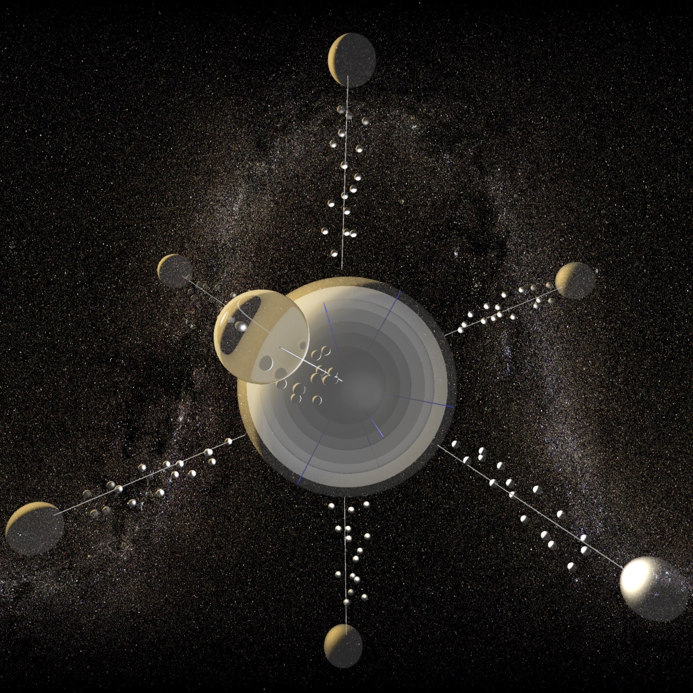 Penta Ro Bolinei é o planeta mais belo da Galáxia. Ele tem quinze diâmetros terrestres, possui oito esferas concêntricas, a mais externa das quais tem cinco diâmetros terrestres, possui também oito Globos Pranélites, cada qual com um diâmetro terrestre. As esferas foram criadas pelos próprios pêntios, com o material chamado fotofrátax. Entre as esferas concêntricas, onde há atmosfera, vivem os aracnopólipos, espécie dominante de Penta, e também outras espécies subalternas. Nos Globos