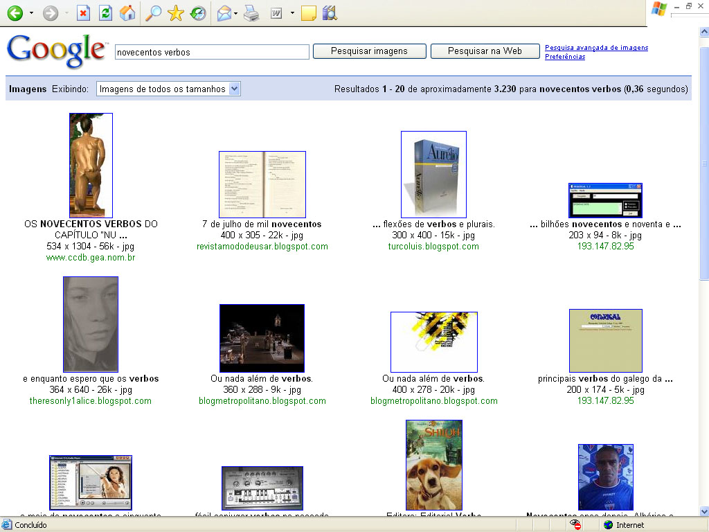 RESULTADOS PARA "NOVECENTOS VERBOS": Na PRIMEIRA PÁGINA DA RESPOSTA À PESQUISA por IMAGENS, o PRIMEIRO LUGAR entre TRÊS MIL DUZENTAS E TRINTA OCORRÊNCIAS!!! Na PRIMEIRA PÁGINA DA RESPOSTA À PESQUISA por TEXTO (WEB), o PRIMEIRO LUGAR entre TRINTA E SEIS MIL E SETECENTAS OCORRÊNCIAS!!!