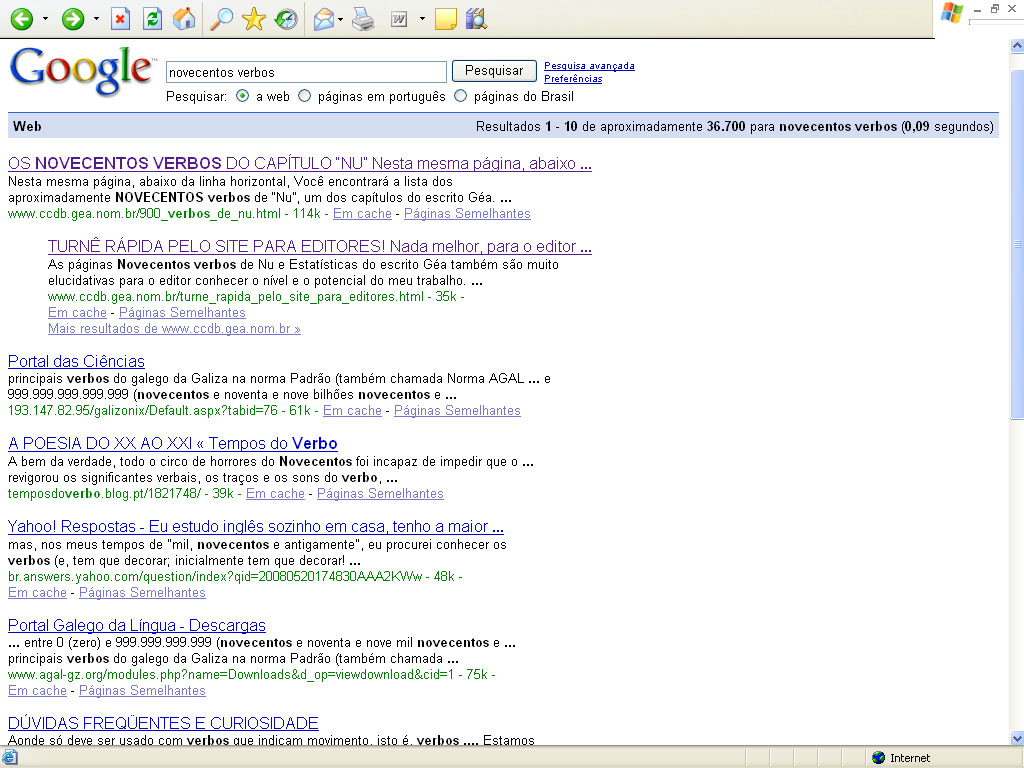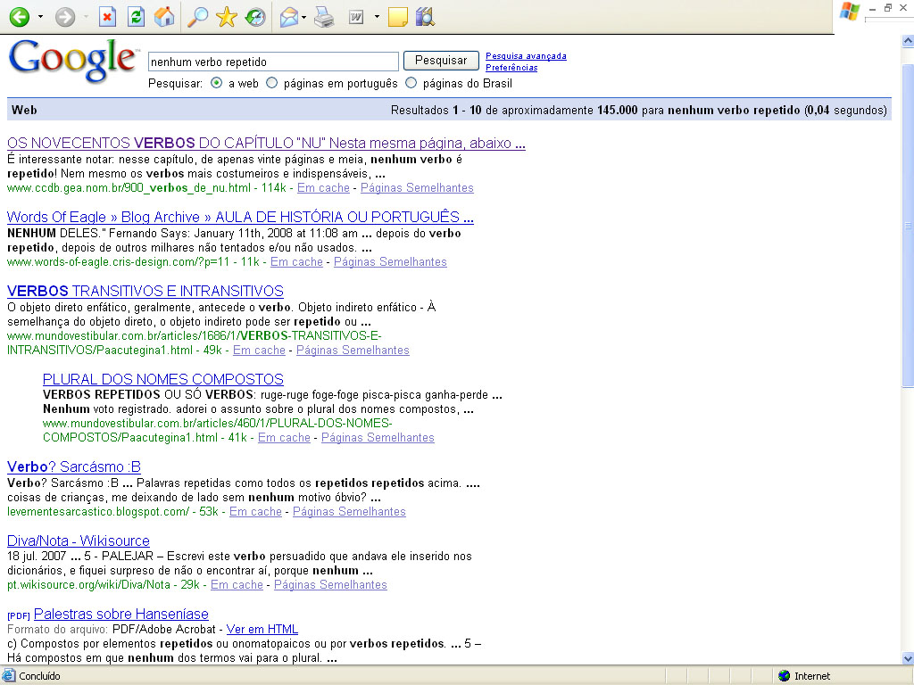 Primeiros lugares na pesquisa do Google: "Novecentos Verbos" e "Nenhum Verbo Repetido"! - CCDB - 23 de Junho de 2008