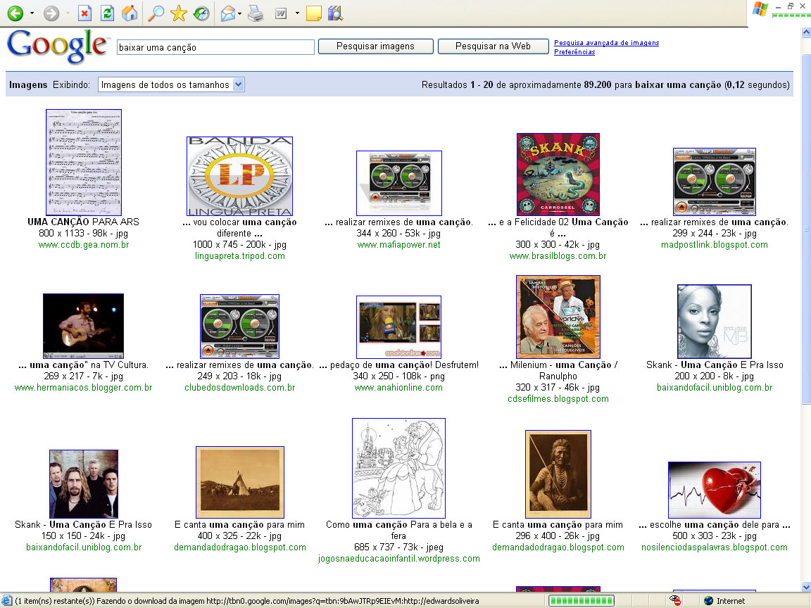 Na PRIMEIRA PÁGINA DA RESPOSTA À PESQUISA por IMAGENS, o PRIMEIRO LUGAR entre OITENTA E NOVE MIL E DUZENTAS OCORRÊNCIAS!!! Na PRIMEIRA PÁGINA DA RESPOSTA À PESQUISA por TEXTO (WEB), o PRIMEIRO LUGAR entre UM MILHÃO, SEISCENTAS E DEZ MIL OCORRÊNCIAS!!! Note que, bem visíveis nas pesquisas por texto (WEB), há vários resultados onde tanto a palavra"Baixar " como as palavra "uma" e "canção" estão presentes, o que valida a pesquisa utilizando-se a frase "Baixar uma Canção" . - CCDB