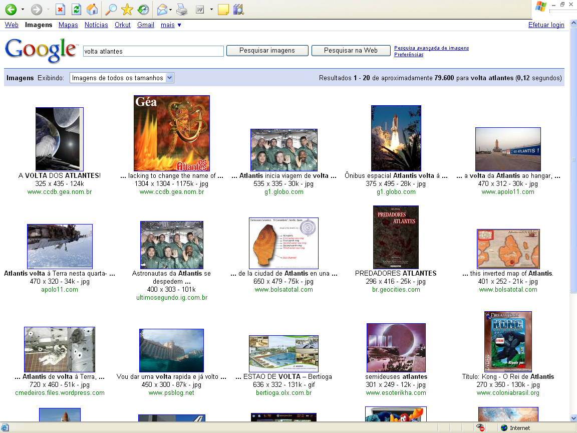 Na página do Google, as duas miniaturas (thumbnails) de ilustrações de minha autoria que ocupam os dois primeiros lugares contêm links que remetem à página A Volta dos Atlantes, uma das mais visitadas deste site que inclui essas imagens. Aqui preferi criar links nas mesmas miniaturas que remetam às páginas de onde deveras provêm - a primeira, azulada, é de uma página de ilustrações dos livros de Géa; a segunda, da própria página "A Volta dos Atlantes".