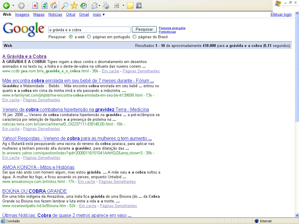 Na PRIMEIRA PÁGINA DA RESPOSTA À PESQUISA, o PRIMEIRO LUGAR entre QUATROCENTAS E DEZOITO MIL OCORRÊNCIAS para a frase "A Grávida e a Cobra"!!! Se pesquisarmos as palavras "Grávida Cobra", ainda teremos o quarto lugar e agora entre SETECENTAS E OITENTA E CINCO MIL OCORRÊNCIAS!