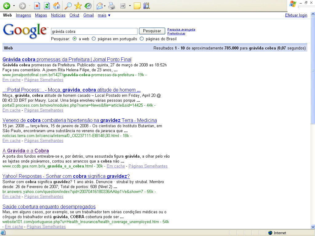 Acima, a ilustração mostra a página do Google com o resultado para a pesquisa da frase "A Grávida e a Cobra"; embaixo, para as palavras "Grávida Cobra". Em ambos os casos a pesquisa é válida, honesta, pois não está restrita a palavras que resultariam obrigatoriamente em resultado único (feito se eu houvesse incluído a sigla CCDB junto com essas palavras, o que resultaria em páginas inteiras repletas de ocorrências só para páginas deste site). Porém, a pesquisa das palavras "Grávida Cobra" abre mais o leque e é absolutamente irrestrita, mesmo assim resultando num bom quarto lugar entre setecentas e oitenta e cinco mil ocorrências. E esse quarto lugar já foi o sexto, depois o quinto e vem subindo!