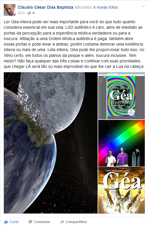 *Assim que ficou pronta a obra Géa, CCDB foi procurado, pelo telefone, por um editor de livros eletrônicos, com cuja editora firmou contrato para a publicação dessa obra. Géa chegou a ser lançada por essa editora, porém sem destaque algum em seu site, e durante os poucos dias em que os treze livros da versão só texto (não havia ainda a versão ilustrada) esteve no ar, nenhum exemplar foi vendido a não ser dois, para amigos de CCDB que os adquiriram para testarem, a pedido do autor, o funcionamento do site da editora bem como a sua seriedade dela. Esses dois exemplares, vendidos e pagos, NÃO foram entregues pela editora (não puderam ser baixados pelos referidos dois amigos); portanto, o lançamento não chegou sequer a realizar-se na prática, e a editora deixou de merecer a confiança de CCDB, que imediatamente rescindiu o contrato, com base nesse episódio - e tem a documentação ao dispor de quem desejar certificar-se. Sendo assim, como pessoa alguma tem em mãos ou em seus computadores os livros de Géa (sem contarmos os amigos a quem CCDB presenteou exemplares exclusivos da obra), Géa é obra inédita e não esteve realmente, nem está hoje (28-07-2007), no mercado. Géa encontra-se absolutamente livre, assim como todos os outros livros de CCDB e aquele em co-autoria com seu filho RDB, todos apresentados neste site, para a assinatura de contratos de publicação em toda e qualquer mídia.