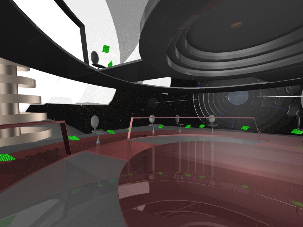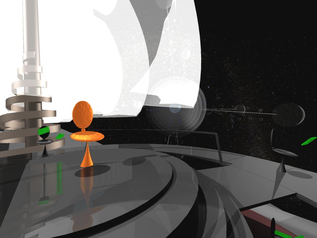 Para que você tenha só um gostinho do que se poderia fazer com mais recursos (e poder-se-ia MUITO MAIS ainda), veja as ilustrações abaixo: eu as produzi com o mínimo de expedientes de raytracing e refração do 3DStudio MAX 6 (apenas duas reflexões e uma só refração, quando o normal ou default é seis de cada), tive de eliminar os materiais refratores no fotofrátax do planeta Penta e no domo sobre o passadiço de Altaré, necessitei esconder a esfera celeste com seus milhares de estrelas e também assaz limitar a iluminação. Mesmo assim, imagine como seria a animação supracitada, se a qualidade de cada fotograma (frame, quadro) fosse a destas ilustrações! E cogite-a então com toda a qualidade que se pode gerar num filme de longa-metragem multimilionário, para o cinema!