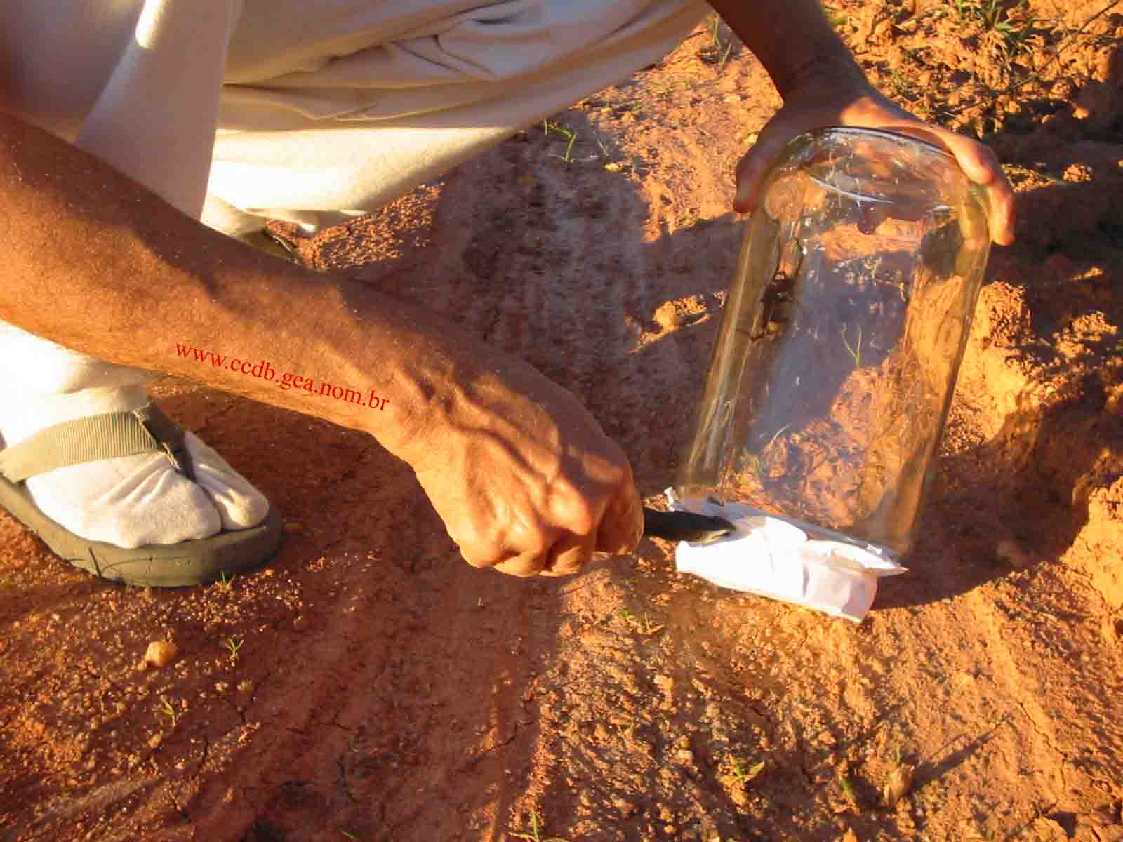 Na imagem acima, eu, CCDB, preparo-me para cortar o cordão de nylon que prende o papel perfurado sobre o vidro, para libertar a Phoneutria perto da mata e longe de residências e outros lugares freqüentados por gente.