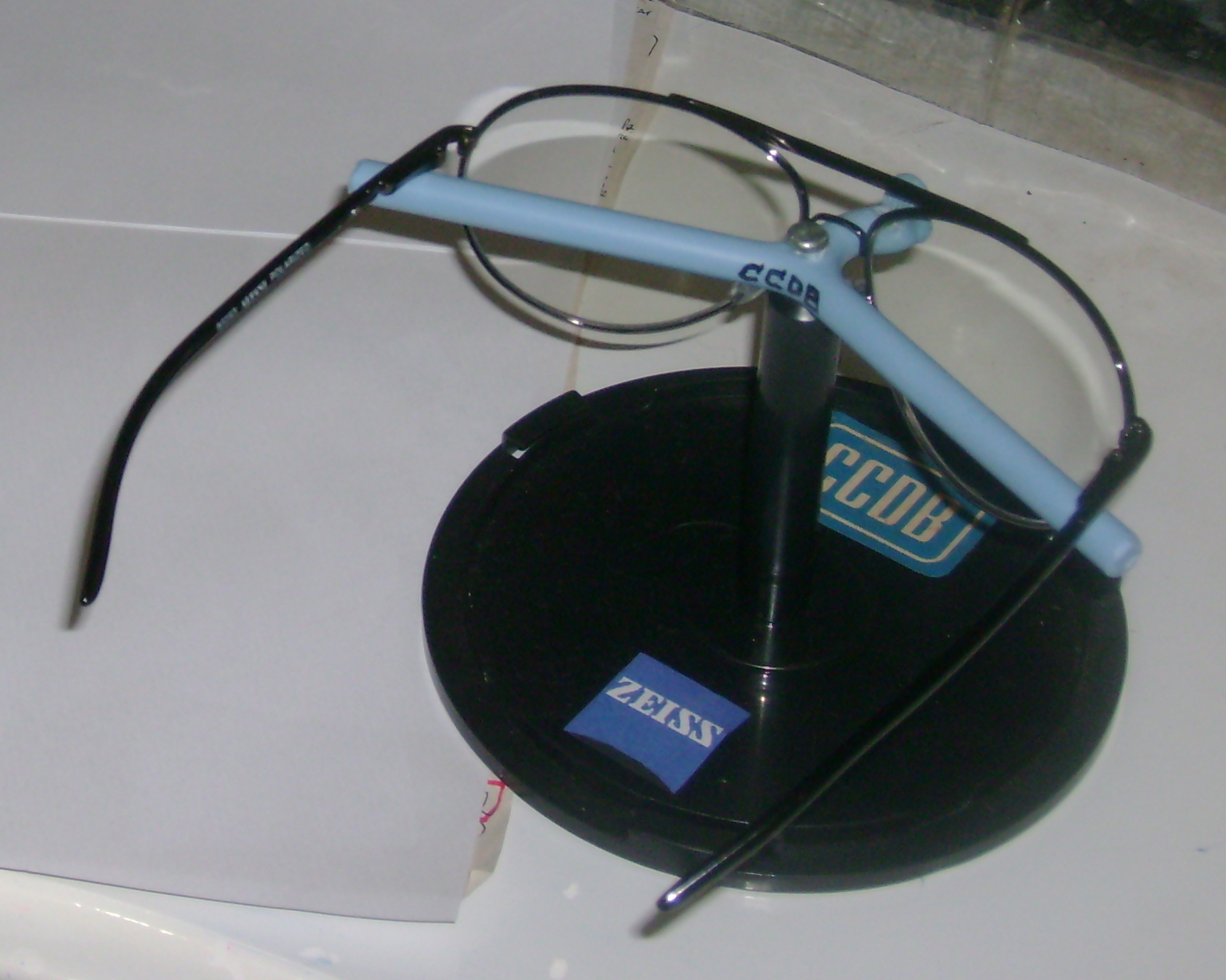 Como é fácil perceber pela foto, fiz o suporte utilizando a base de uma embalagem para DVD tipo pino e um cabide de plástico que cortei e amoldei com um alicate sobre a chama do fogão a gás - além disso há o parafuso e os logotipos “CCDB ©” e “Zeiss ©” que colei além de uma arruela para dar peso (invisível na foto) colada por debaixo à base de modo que o todo não se levante quando dele colho o par de óculos.