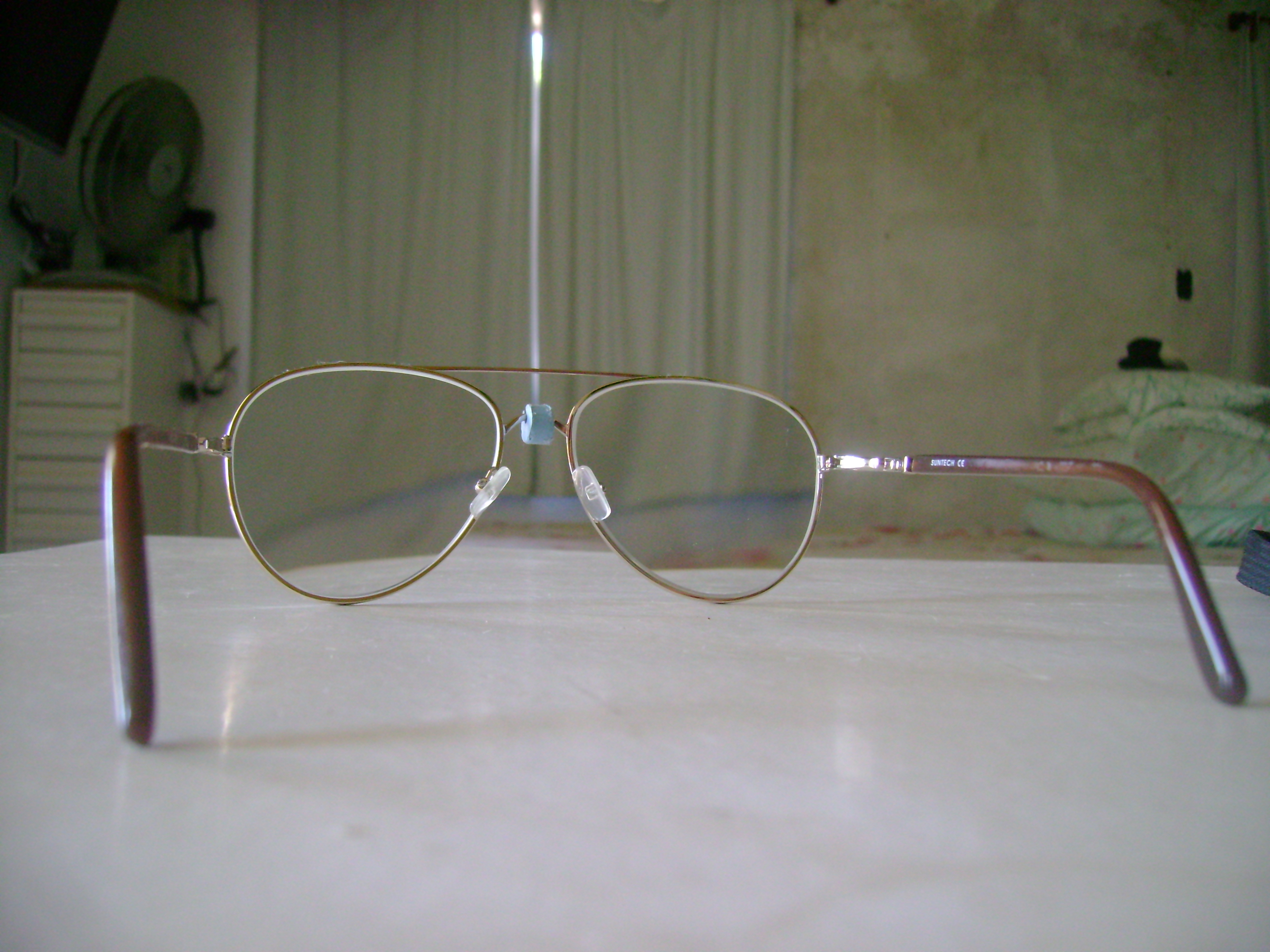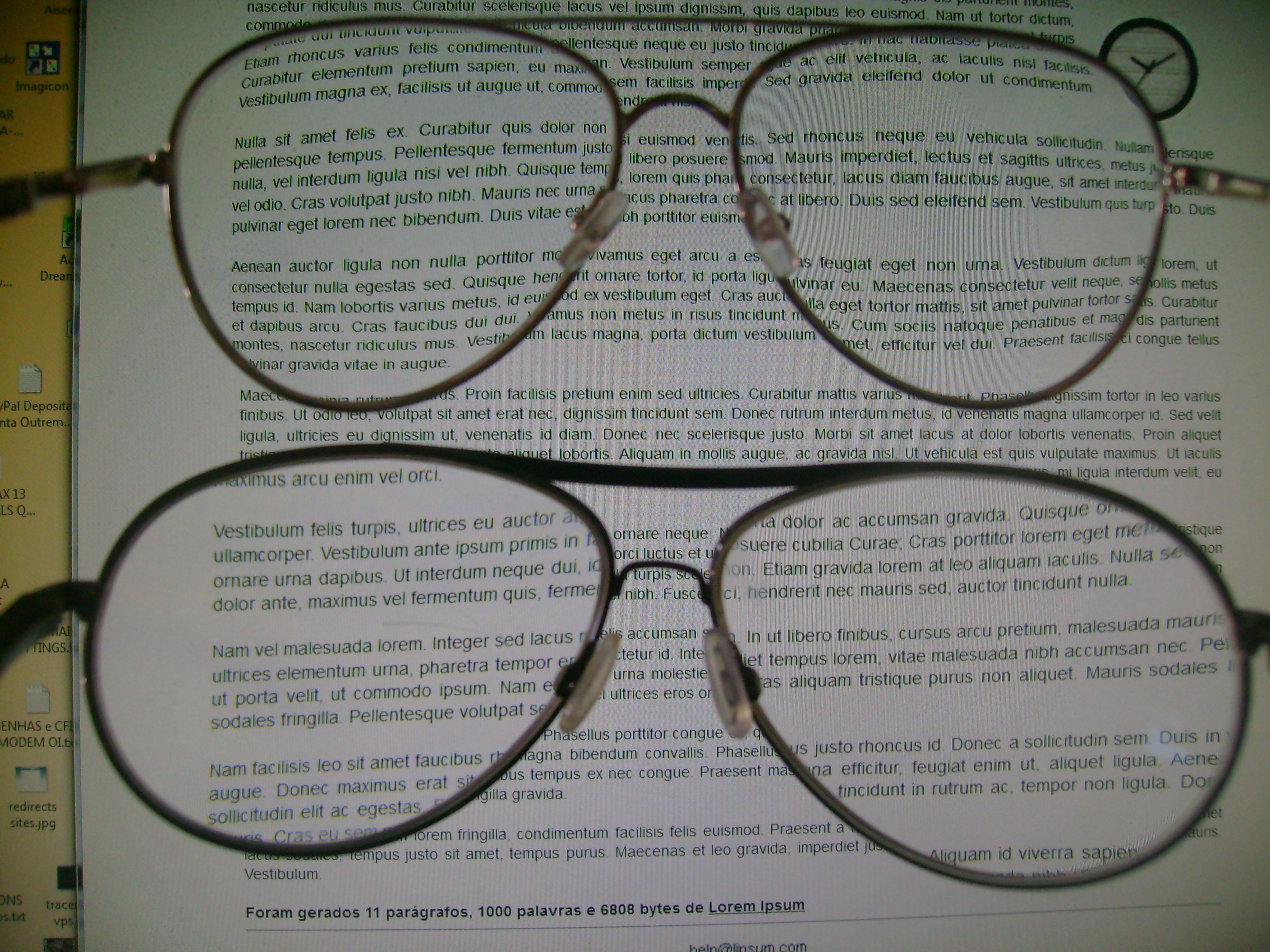 Armação velha, toda remendada, lentes boas, porém pesadas, os óculos para uso no computador, vistos mais acima, vinham machucando-me o nariz a ponto de sangrar. Mandei fazer na Ótica VIP de Rio das Ostras novas lentes com armação mais leve e menor, ainda apta a abarcar a tela inteira do monitor grande que utilizo para produção de músicas e animações. A vendedora sugeriu outras, duravision, que não as solicitadas por mim, de policarbonato como as antigas- e, confiando, aceitei. As outras eram impossíveis de usar, com foco bom só no centro da imagem. As fotos abaixo ilustram o problema com essas lentes. Escrevi à Zeiss, que me atendeu como se espera de tal empresa e me brindou com lentes SUPERB, cujo preço é muito maior, sem me cobrar extras. Estas, as SUPERB, dão imagem absolutamente perfeita em todos os ângulos. Meu Muito Obrigado à ZEISS!!! Eis as fotos: