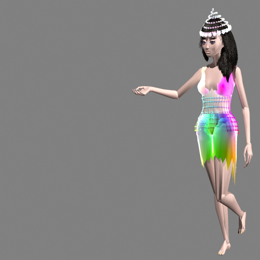 Talia com treze anos de idade, de corpo inteiro em fundo cinzento. Note que o cabelo de Talia se apresenta em posição diferente de nas outras ilustrações suas para looks, úteis no byMK (atualmente, Fashion,me). Também os membros, a cabeça, os olhos; tudo é móvel e pode ser animado para criarem-se filmes! Veja que Talia com treze anos de idade tem o corpo dimensionado para essa idade; compare-a com ela própria aos dezesseis anos, também encontrada entre os meus itens do byMK e no meu site, www.ccdb.gea.nom.br.