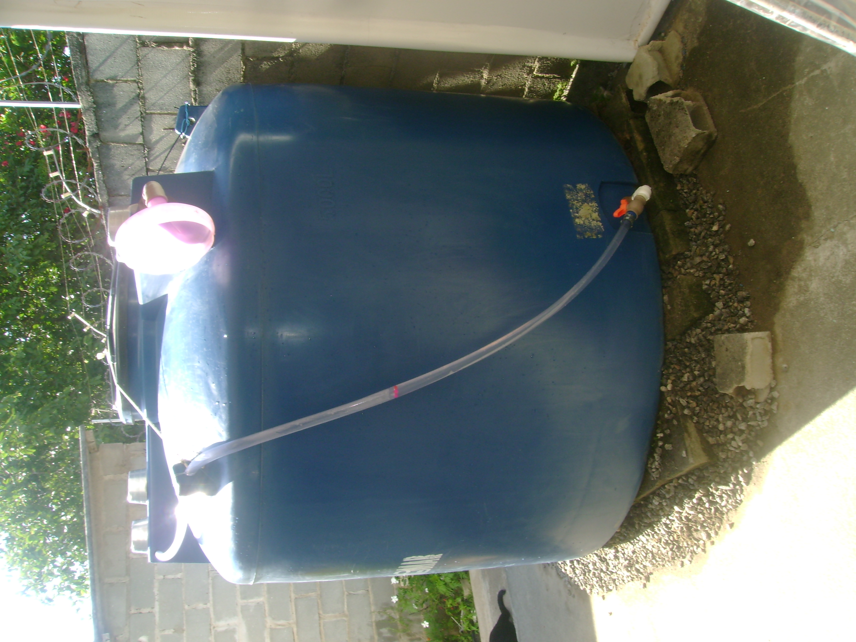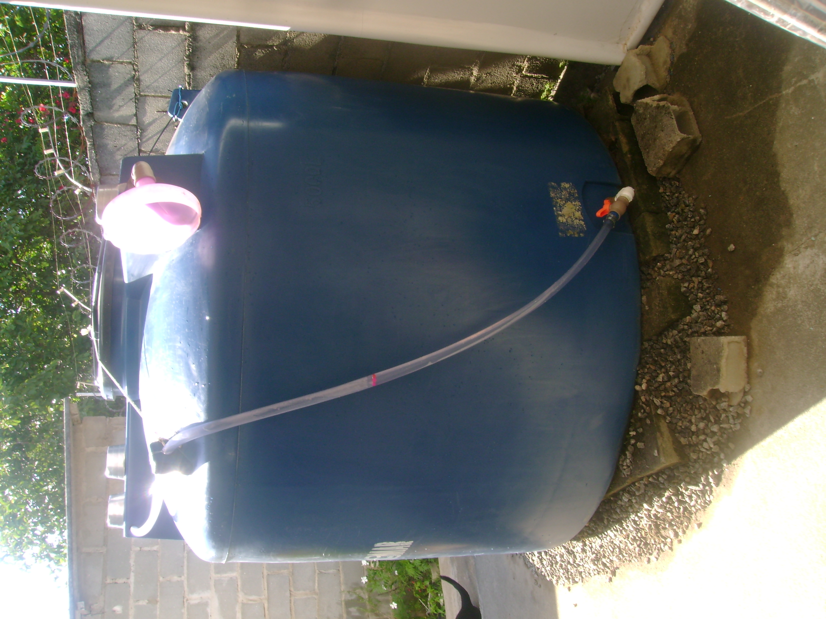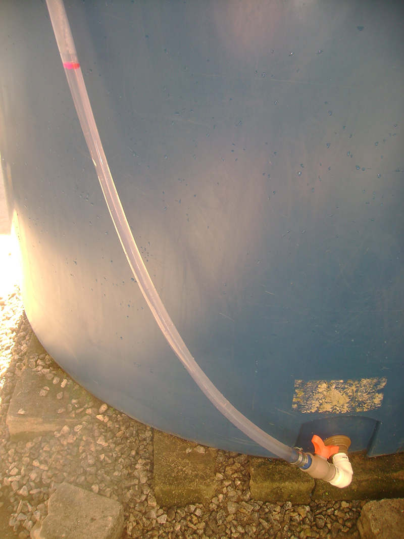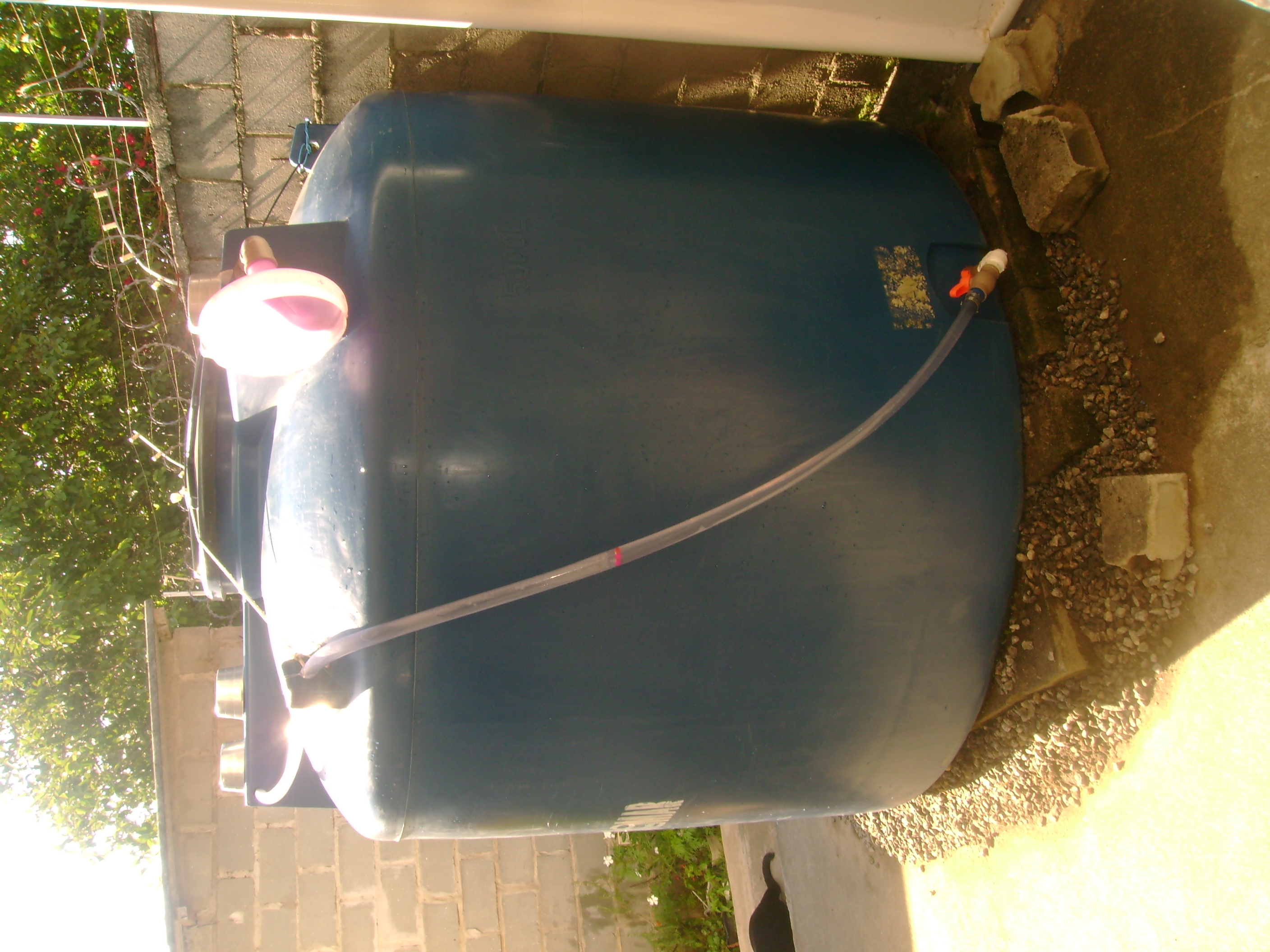 Então, em 2019, Dalgiza e eu tivemos a idéia e confeccionamos o medidor de nível, que consta da mangueira transparente com umas bolinhas plásticas coloridas dentro, uma rede no ponto de inserção da mangueira (para que as bolinhas não fluam tanque adentro quando este se esvazia) e um conjunto de peças plásticas que conecta a mangueira ao tanque (e que só não dá vazamentos porque na segunda tentativa substituímos as peças e em especial o retentor por outros, da marca Tigre - cuja propaganda faço grátis e é sincera, porquanto verdadeira).