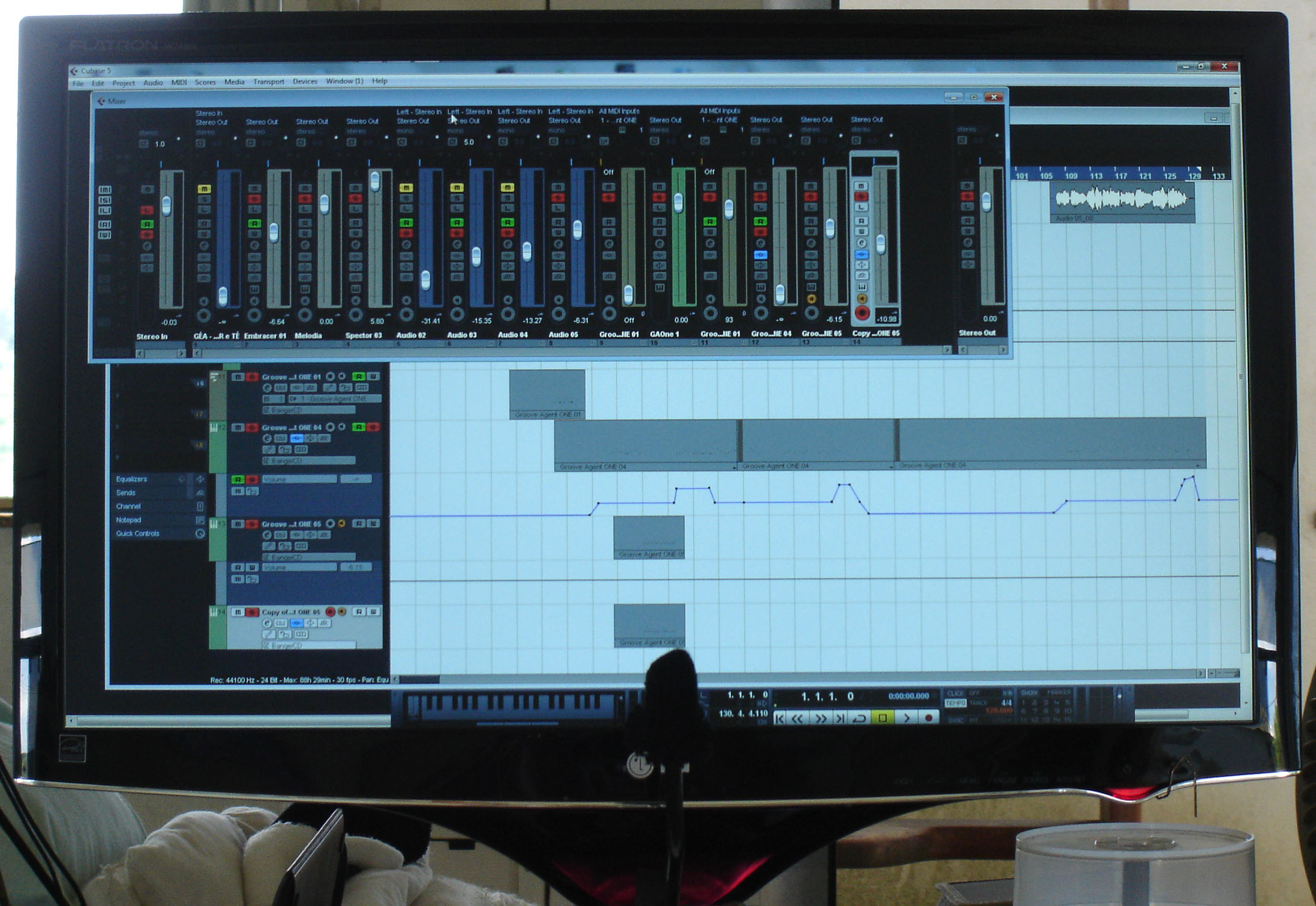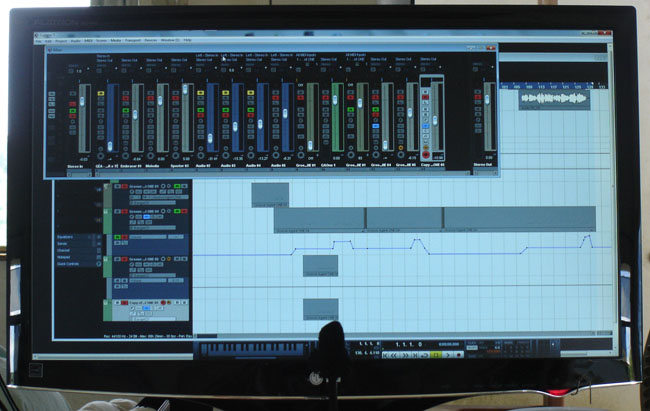Gravei minha voz em várias trilhas (tracks); na principal, com um microfone de dez reais (visível na foto, frente ao monitor de vídeo), tipo eletreto, para computadores, e nas outras com um velhíssimo Shure SM-58 que tem de levar pancada para funcionar.
