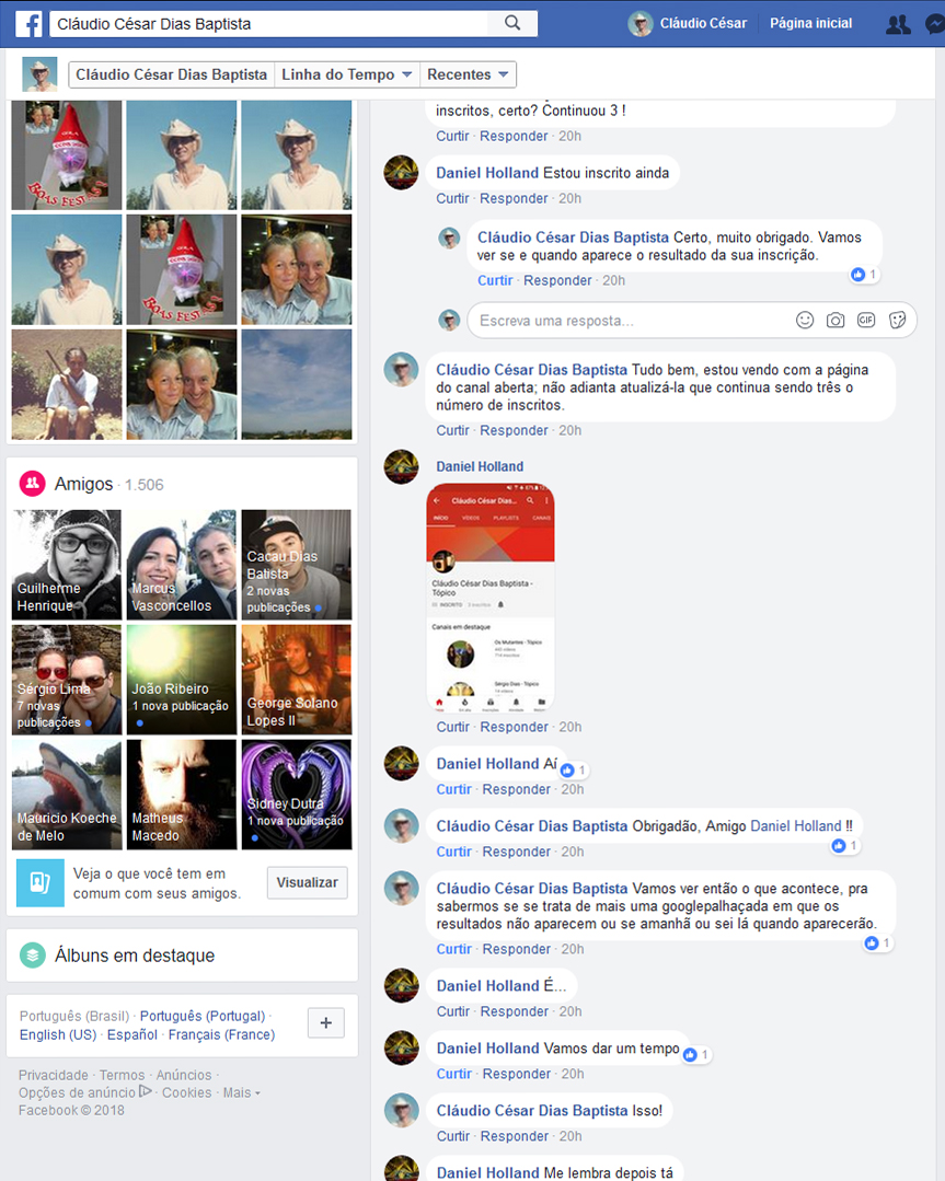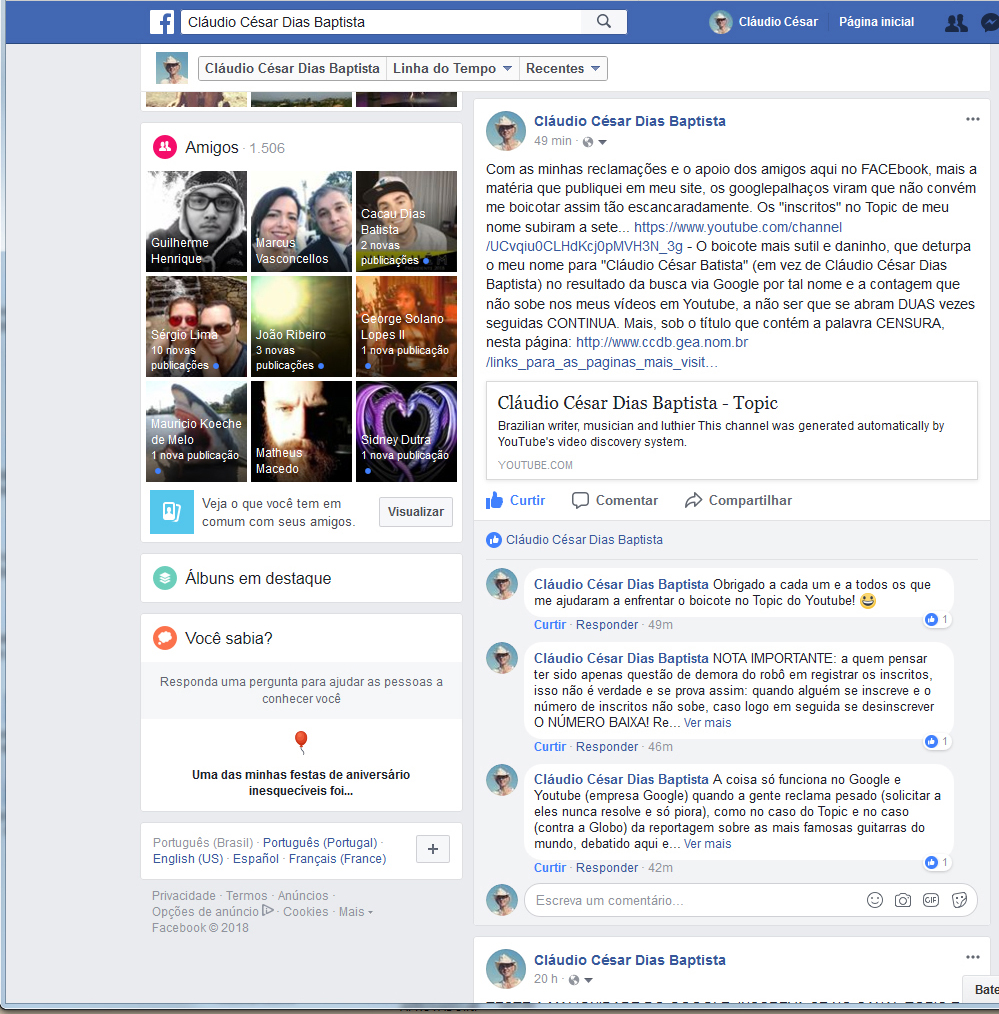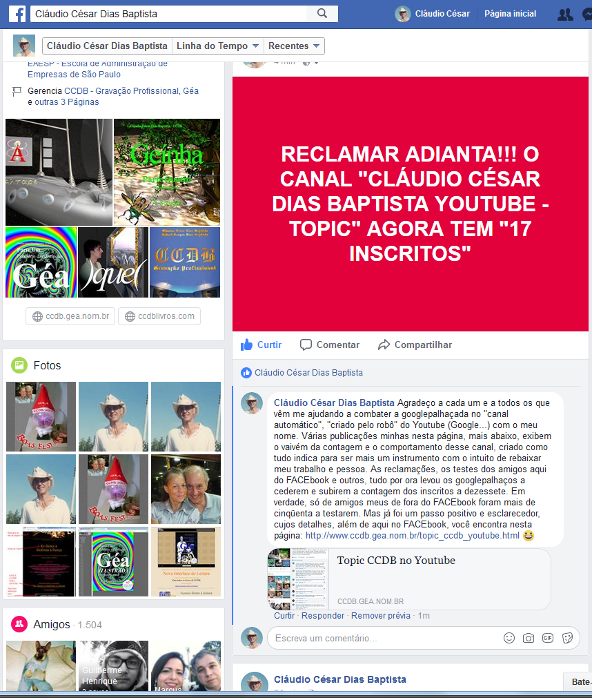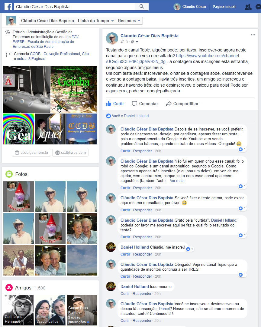 Há pouco tempo surgiu do nada, segundo o Youtube criado automaticamente pelo seu robô, um canal em meu nome, “Cláudio César Dias Baptista - Topic”, no Youtube.